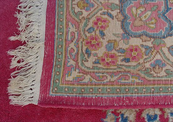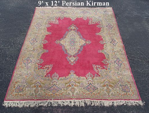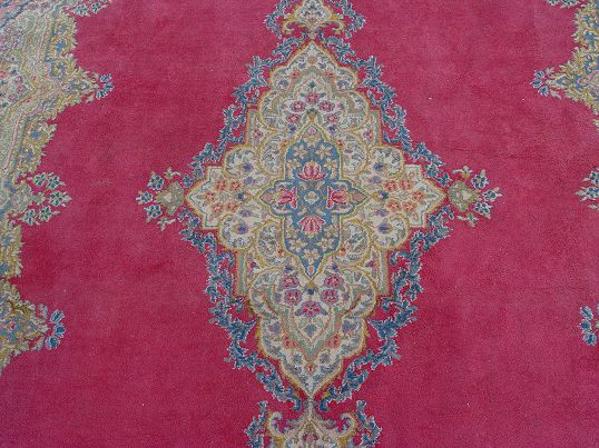 PERSIAN KERMAN CARPET: Approx 12' x 8' 9''. Deep rose ground, center medallion.