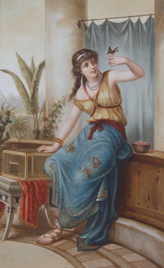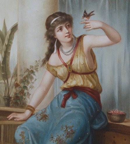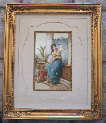 PAINTING ON PORCELAIN OF A YOUNG MAIDEN IN A GRECIAN SETTING WITH HER PET BIRD: 12 5/8'' x 8'', no visible signature, encased in a carved and gilded frame, 25'' x 21'', no visible marks verso, no impressed marks on the porcelain. Est. $800/1200**