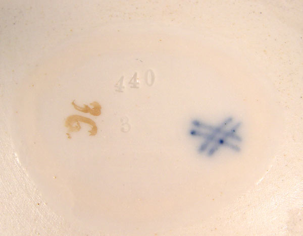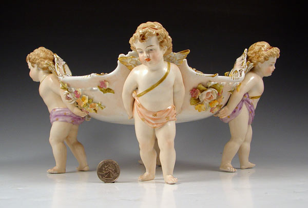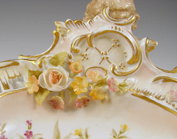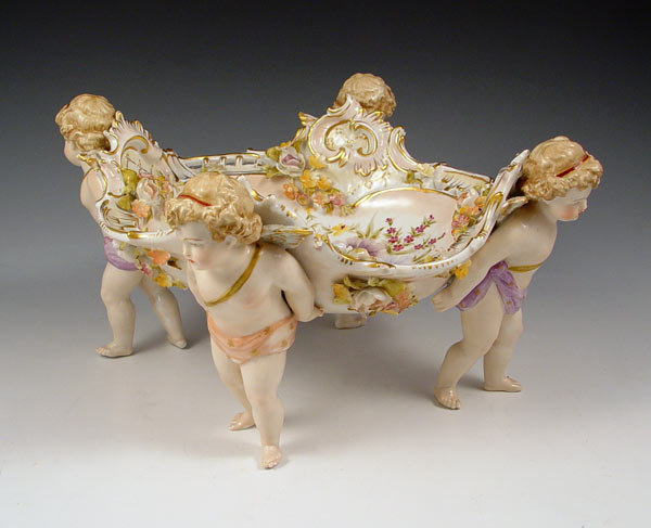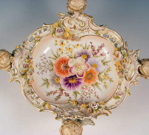 ORNATE GERMAN PORCELAIN 18'' TALL PEDESTAL BOWL: Tall candle stick type pedestal surmounted by a flower encrusted reticulated bowl. Four parts with upper having later putty adhesive. Blue cross sword marks under glaze (Meissen ?). Measures 18'' h. x 12'' x 9''. Note chips on flowers