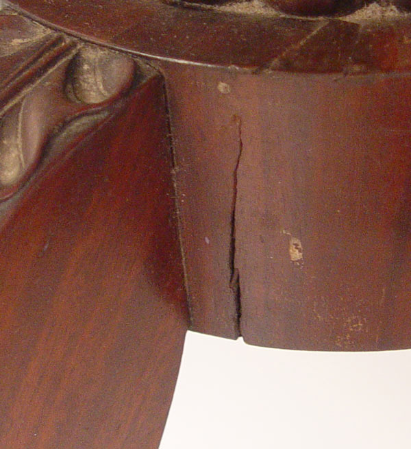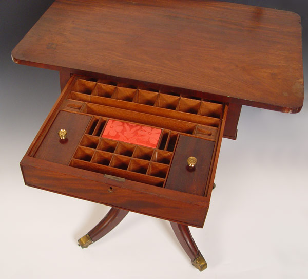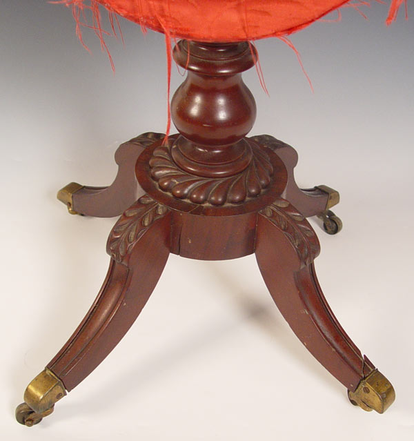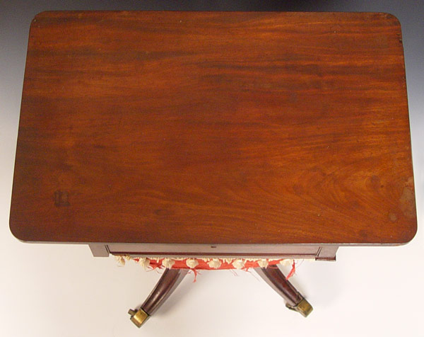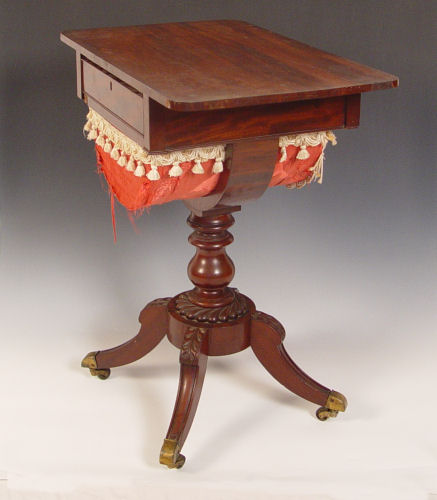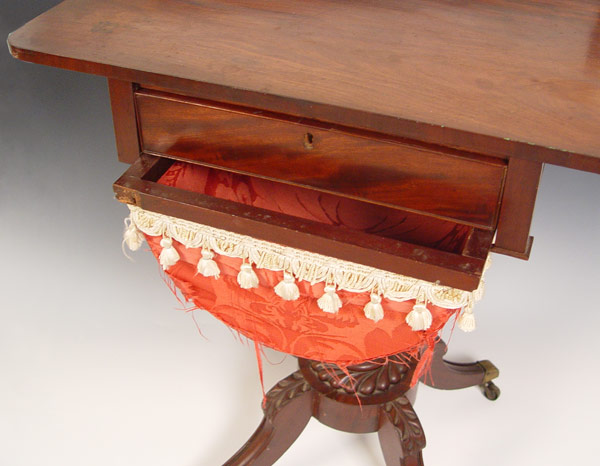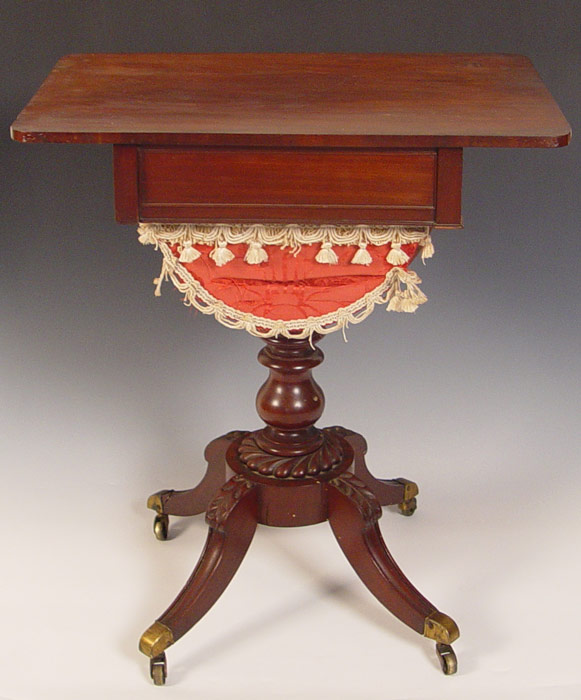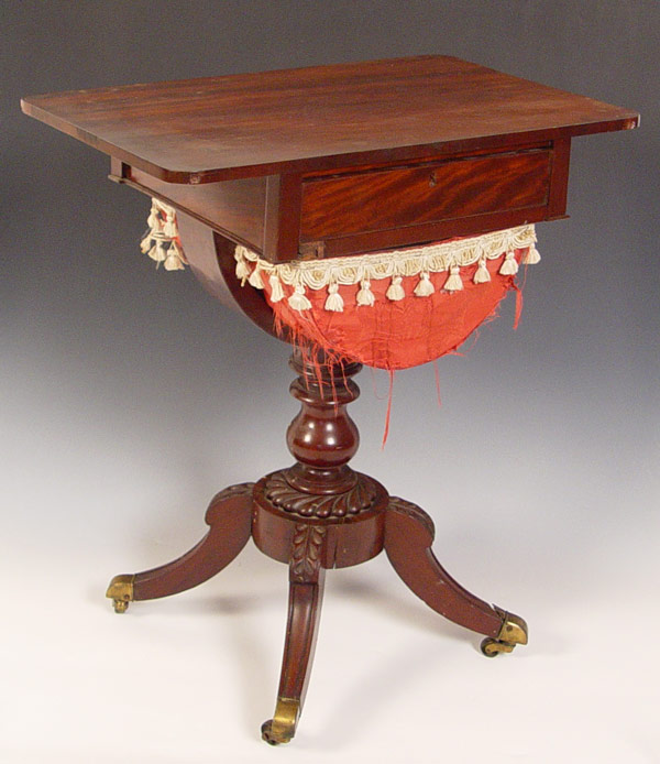 19th C MAHOGANY WORK / SEWING STAND: Top drawer fitted with compartments and pin cushion, lower drawer is the fabric work basket. Single pedestal, splayed feet ending in castors. Measures 29'' x 25 1/4'' x 16 1/4''.