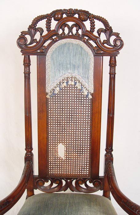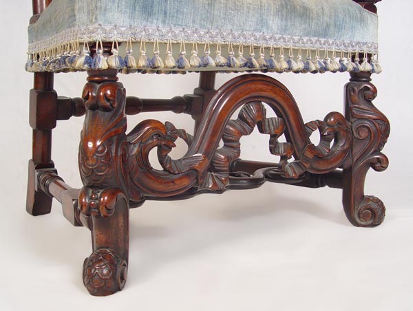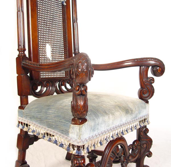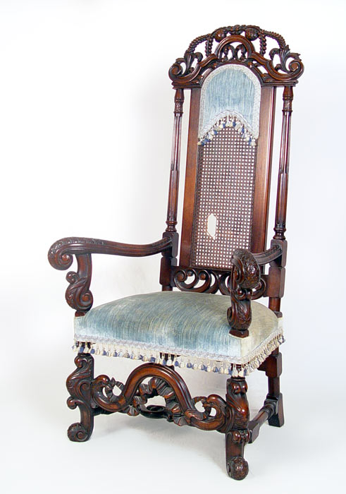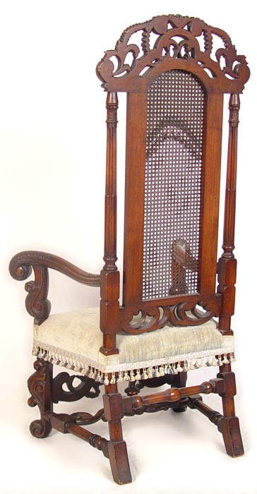 WILLIAM & MARY STYLE VICTORIAN WALNUT CARVED ARM CHAIR: fine and heavily carved tall crest above caned back and upholstered seat with tassels. Fish scale carved arms and legs. Carved bird head front stretcher. Measures 60'' h x 30 1/2'' x 25'' Est. $400/600**