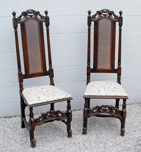 PAIR OF HIGH BACK WILLIAM & CARVED MAHOGANY TALL BACK CHAIRS: Measure 50 1/2'' x 18 1/2'' x 20''.