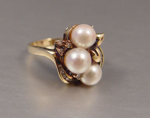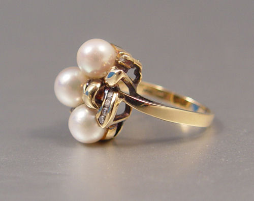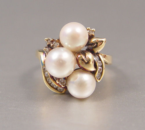 PEARL AND DIAMOND RING: 14K yellow gold ring contains three 6.50 - 7.00 mm cultured pearls and fourteen round brilliant cut diamonds. Weight: .30 Ct. Approx. The diamonds average VS-SI in clarity and H-I in color. The pearls are peg set. The diamonds are prong and channel set. Weight: 6.5 grams. Size: 6.5