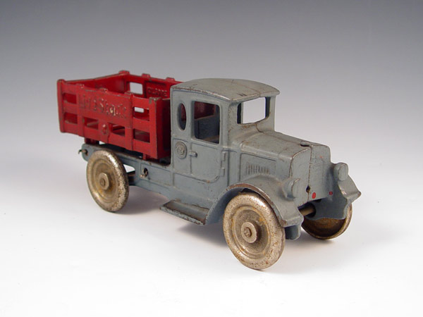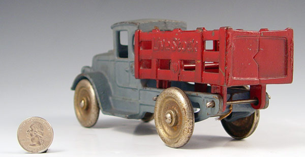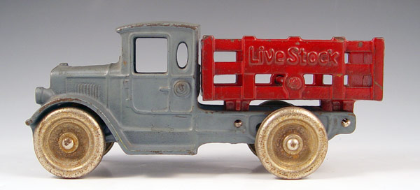 KILGORE CAST IRON LIVESTOCK TRUCK: Original paint, light blue body with red bed. Nickeled wheels. Measures 3 5/8'' high x 8'' x 3''. Est. $600/800**