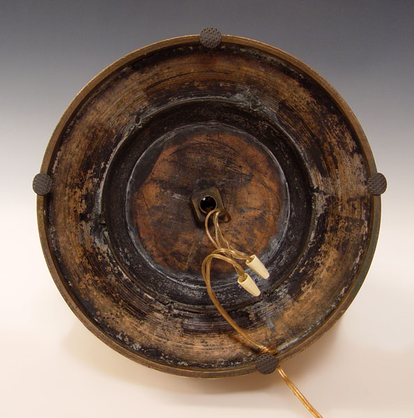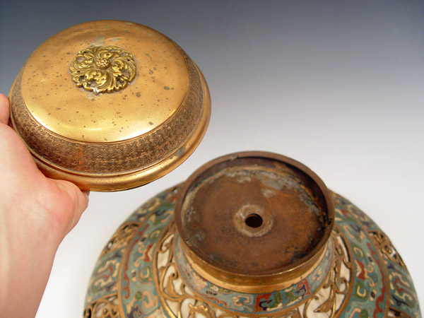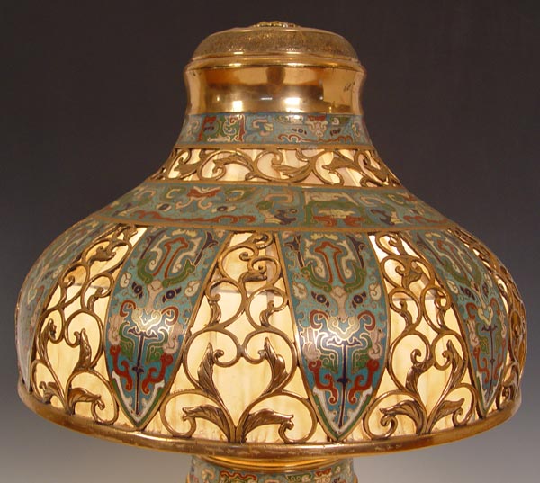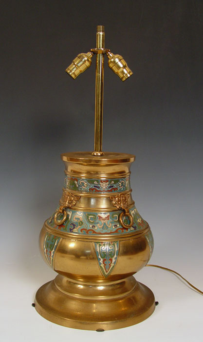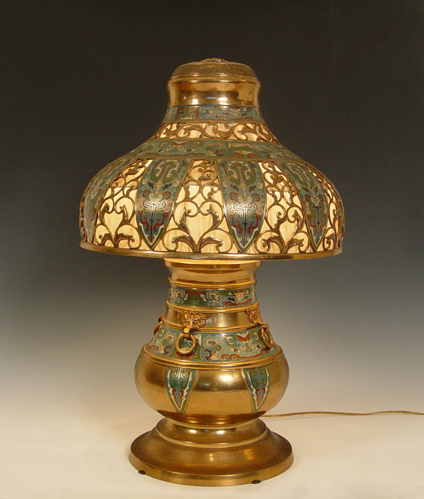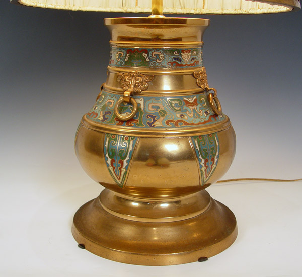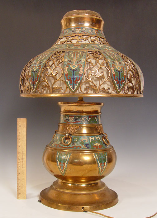 LARGE CHINESE BRASS CHAMPLEVE LAMP: Champleve base and shade. The lamp is 28 1/2''h., the shade 18'' dia., base 12'' dia.
