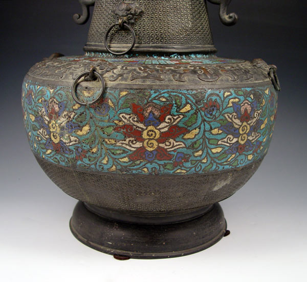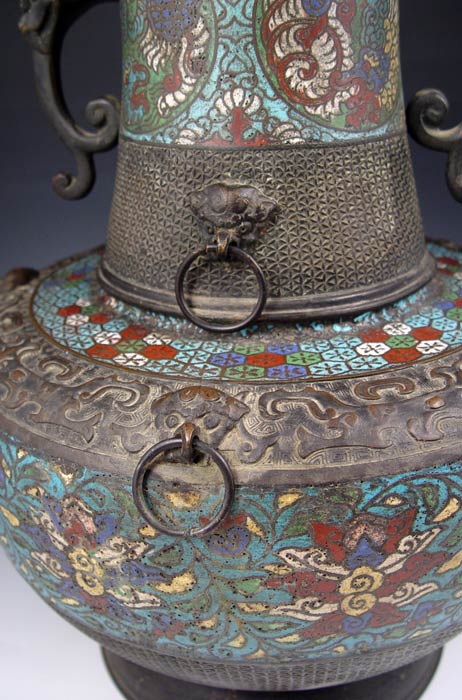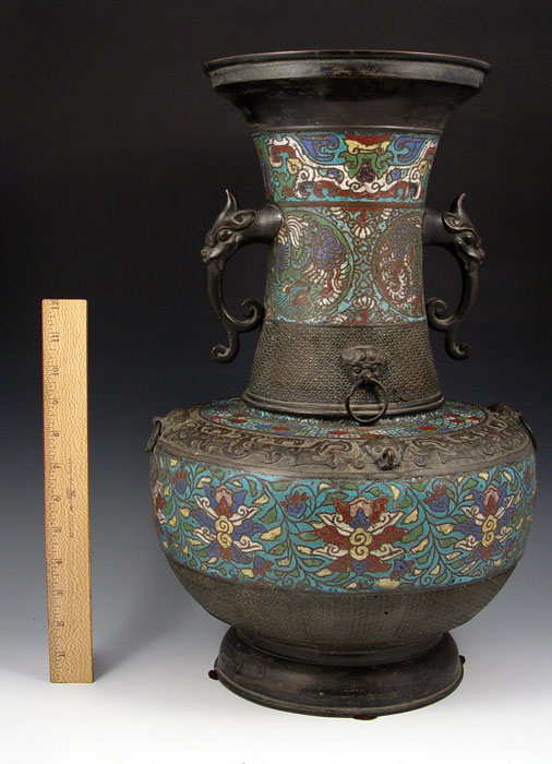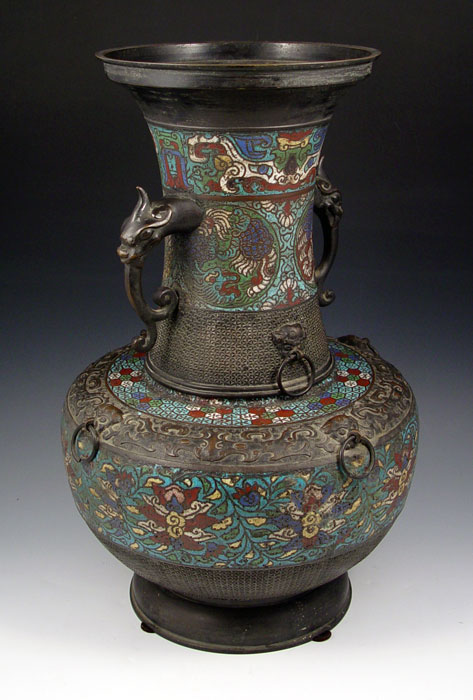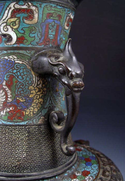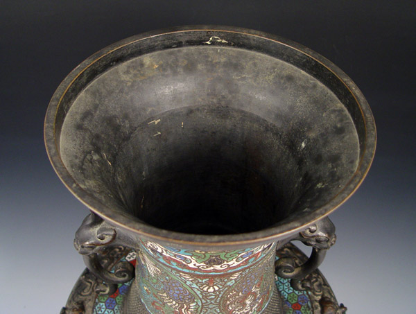 CHINESE CHAMPLEVE VASE: With dragon head handles, 19'' tall.