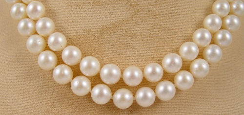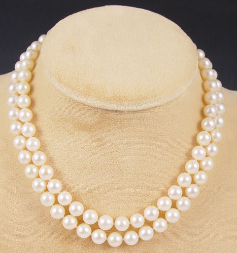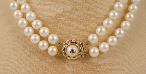 16'' DOUBLE STRAND CULTURED PEARLS: Double strand of 7.50 - 8.00mm cultured pearls. Cream in color, slight rose overtone. Slightly blemished. Medium luster. 14K yellow gold round rope clasp with pearl center.