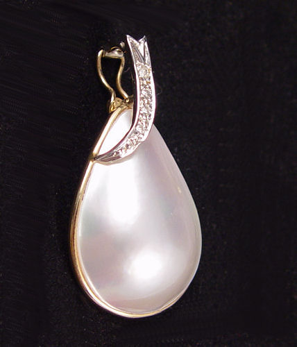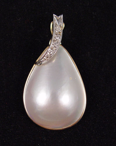 MABE' PEARL AND DIAMOND ENHANCER: 14K yellow gold enhancer contains one pear shaped 24.00 x 18.00 mm cultured mabé pearl and 4 round full cut diamonds, Diamond weight is approx. .03 Ct. The pearl is bezel set. The diamonds are prong set. Figure eight enhancer clasp. Weight: 3.7 grams.