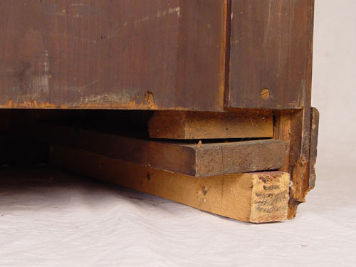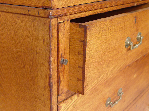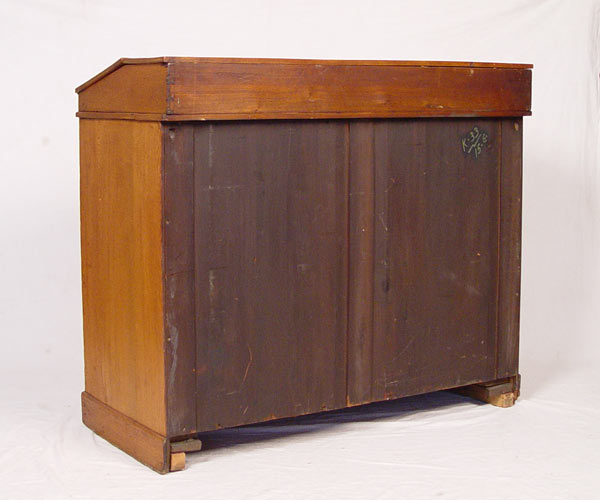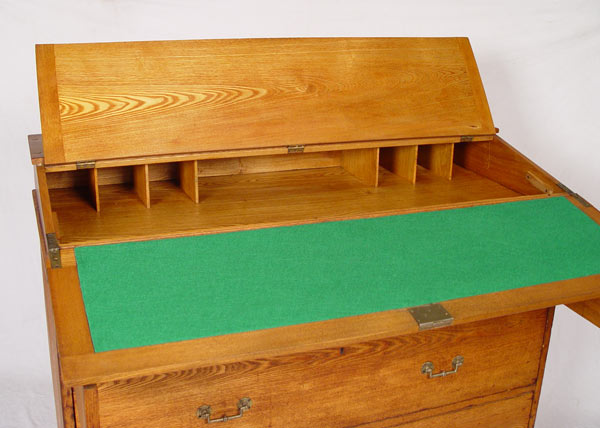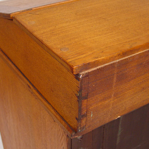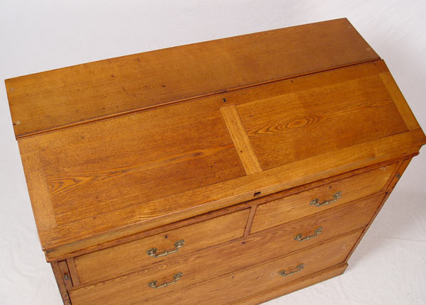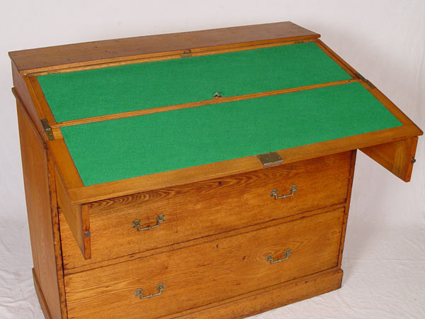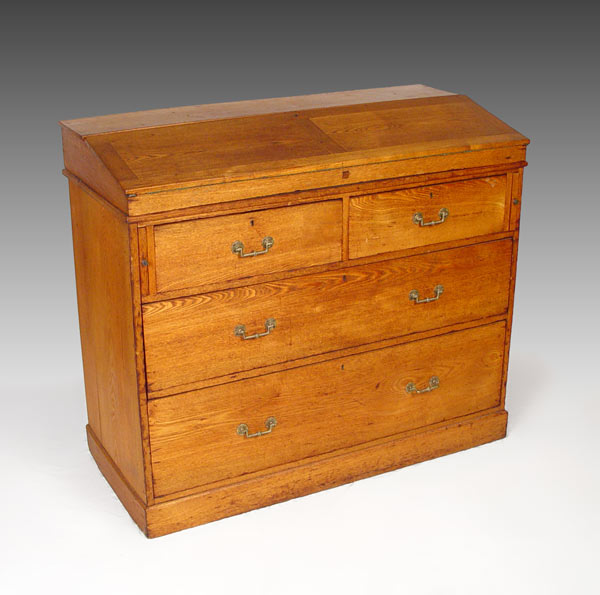 SLANTED FLIP TOP DESK: Dovetail, peg construction with replaced hinges. Flip top conceals the hidden storage and cubicles. Two half length drawers over two full length drawers. 39'' x 45'' x 20 1/2''.