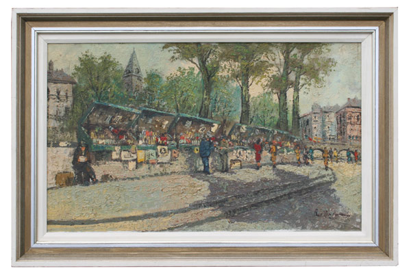 LARGE EXCEPTIONAL PARISIAN SCHOOL MARKET SCENE OIL/C, ILLEGIBLY SIGNED DUBOIS?: 20 1/4'' x 33'', frame 26'' x 39''. Est. $400/600**