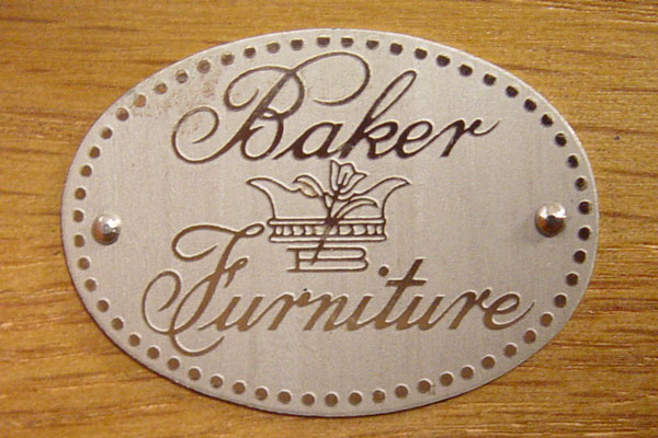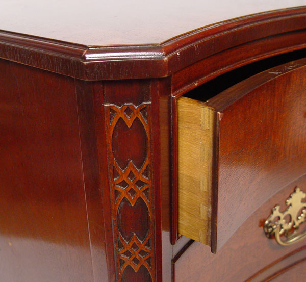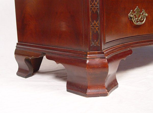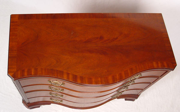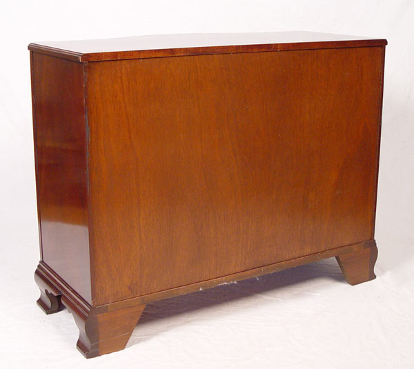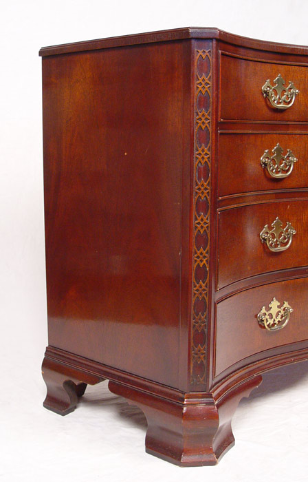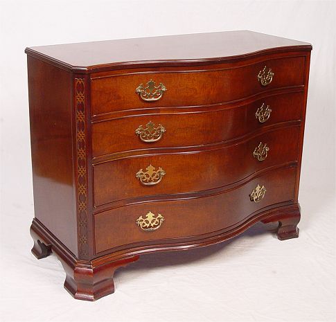 BAKER FURNITURE BANDED MAHOGANY SERPENTINE FRONT CHEST: Four drawer chest bears the Baker metal nameplate. Measures 33'' h. x 42'' x 20''.