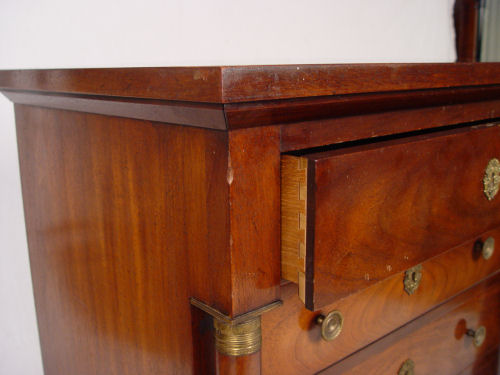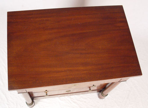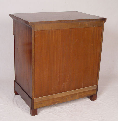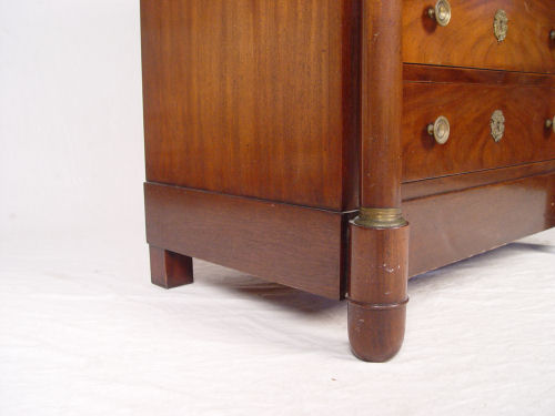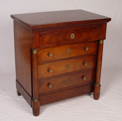 BAKER EMPIRE STYLE CHEST: Overhanging top drawer over three drawers, columnar stiles. Bears the metal Baker medallion. Approx. 34''h x 31'' x 21''.