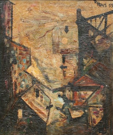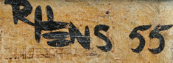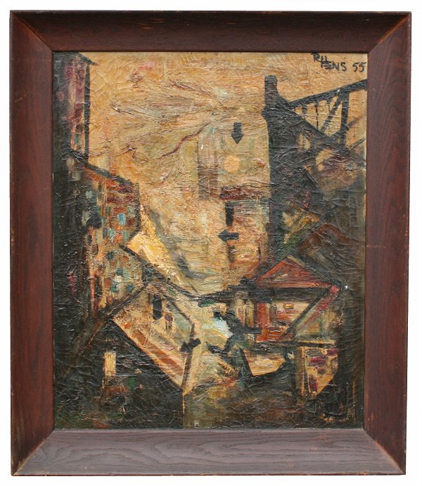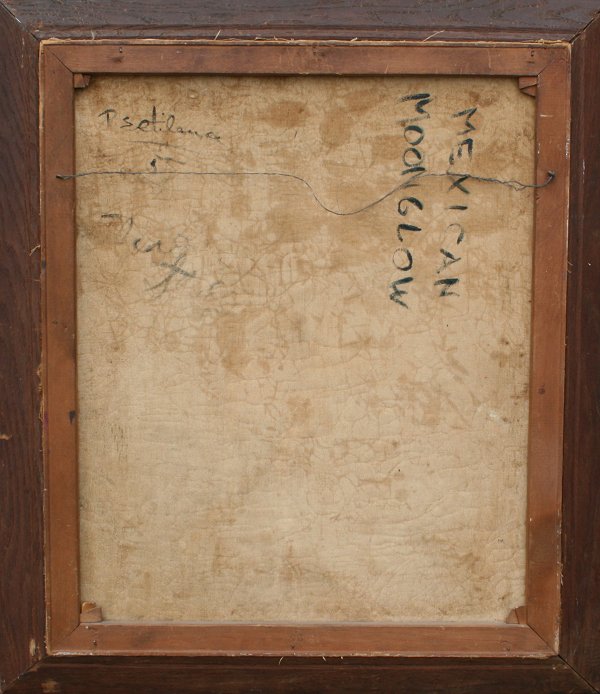 MEXICAN MOONGLOW OIL/CANVAS: 30'' x 25'', signed RHENS? dated '55, wood frame, 35 3/4'' x 30 3/4'', titled verso, with illegible writing. Est. $800/1200**