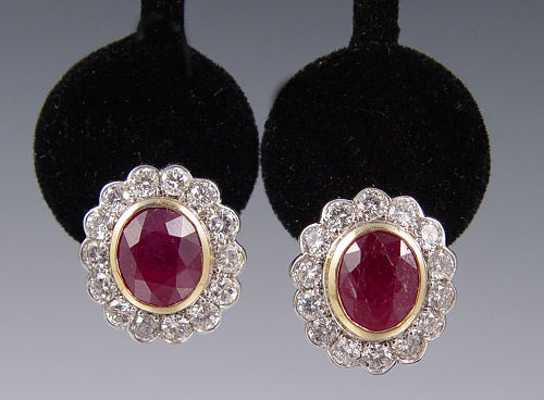 18K AND PLATINUM RUBY & DIAMOND EARRINGS: 18K white and yellow gold earrings contain 28 round brilliant cut diamonds, total weight approx. 2.25 Ct. The diamonds average VS in clarity and H-I in color. Each earring centers an approx. 3 Ct. oval shaped mixed cut ruby, rated SI-I1 in clarity, stpR in Hue, 6-7 in Tone and 3 in Saturation. The rubies are bezel set. The diamonds are prong and half bezel set. Post and French clip closures. Weight: 13.9 grams. Est. $4000/4500**