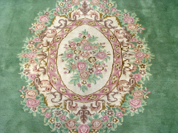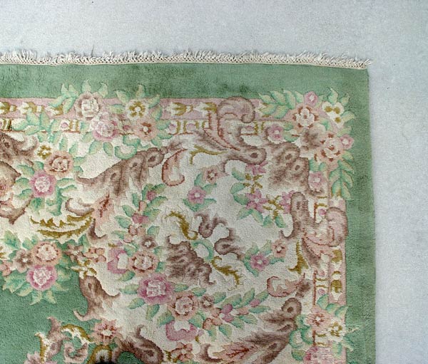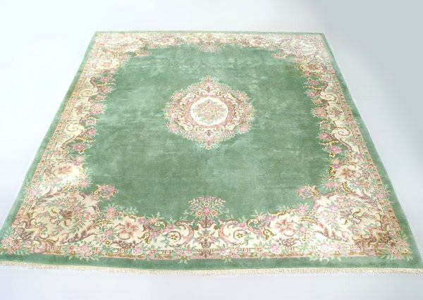 LARGE HAND TIED CARPET: Light green in color, used condition. 14' 9'' x 11' 8 1/2''