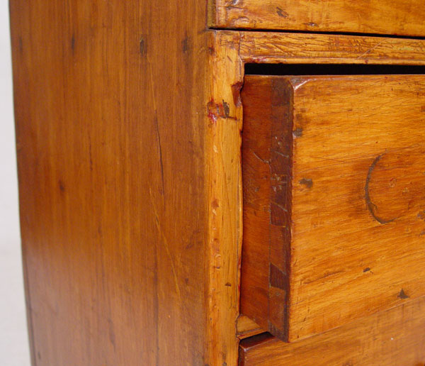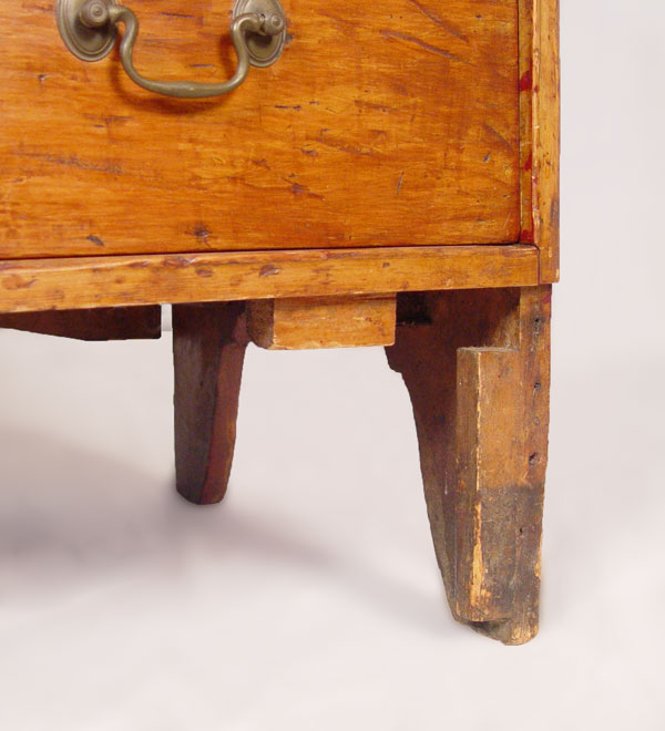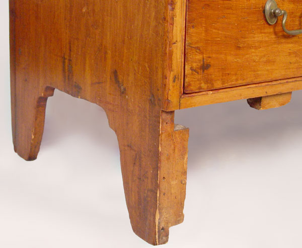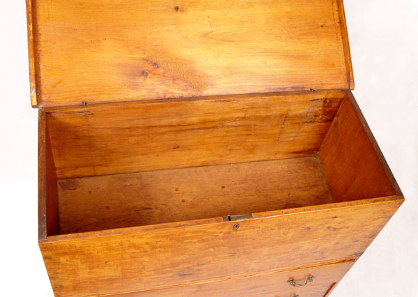 18TH CENTURY NEW YORK 2 DRAWER LIFT TOP MULE CHEST: Single hinges, 2 board back and unusual base cutouts. Front base panel missing below drawers. Still maintains great form which one would expect from a fine country piece. Old refinish, both drawers with early bale handles, not original to the piece. 38'' h. x 41'' x 18''