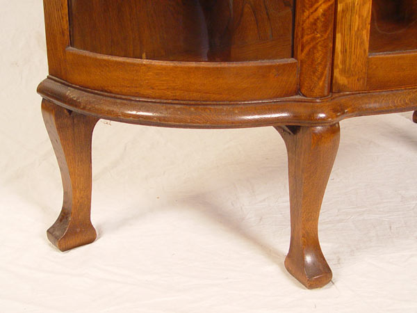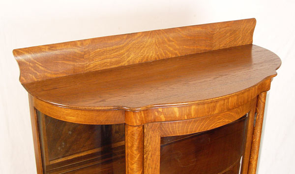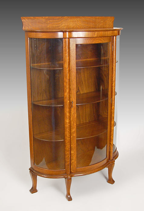 TRIPLE BOW FRONT OAK CHINA CABINET: Late Victorian quarter sawn oak veneer with curved glass sides and single door with curved glass and key. 3 oak interior shelves. 67 3/4'' high x 42'' x 17''