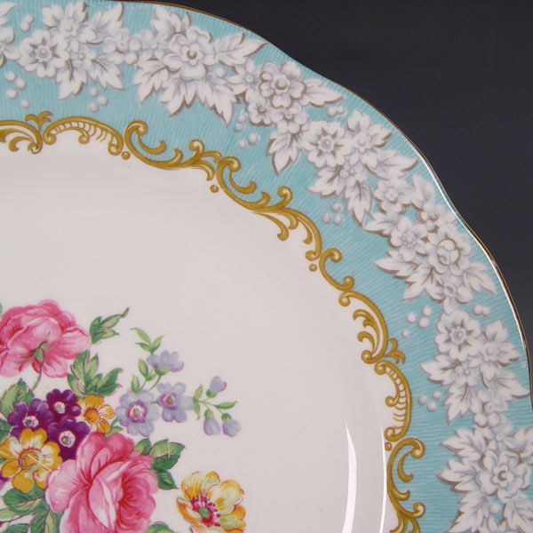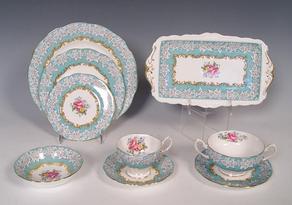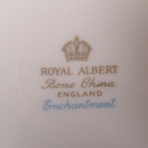 ROYAL ALBERT ''ENCHANTMENT'' CHINA SERVICE FOR 6: 45 piece service to include teapot, creamer, sugar, rectangular tray and pin tray. Also 6 dinner plates, 6 luncheon plates (1 chip), 6 dessert bowls, 6 tea cups, 6 saucers, 4 double handle cream soups and 6 soup saucers.