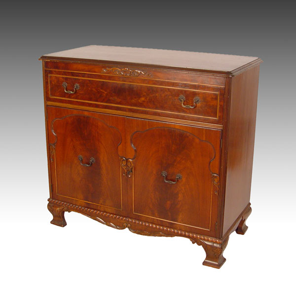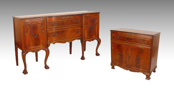 LATE 19TH EARLY 20TH C MAHOGANY CLAW AND BALL FOOT SIDEBOARD & SERVER: To include single drawer over 2 door SERVER with interior shelf. Applied details and shaped foot. Sideboard 37 1/2''h x 67'' x 19''. Server 35'' h x 38'' x 18''. SIDEBOARD with drawer over drawer in center with door on each side. Applied details, Supported by 8 cabriole legs with claw and ball carved feet.