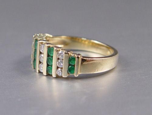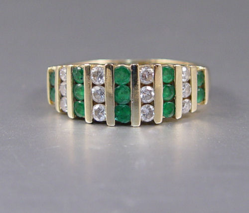 14K EMERALD & DIAMOND RING: 14K yellow gold ring contains twelve round brilliant cut diamonds. Weight: .40 Ct. Approx. The diamonds average VS in clarity and H-I in color. Twelve round mixed cut emeralds. Weight: .40 Ct. Approx. The diamonds and emeralds are channel set. Weight: 3.8 grams. Size: 5 Est. $250/350**