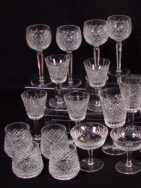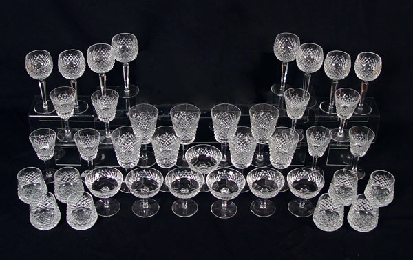 39 PIECE WATERFORD CRYSTAL IN THE ALANA PATTERN: To include 8 water goblets (7''), 8 wine hocks (7 1/2''), 8 wine (5 7/8''), 8 roly polu tumblers (3 1/2''), and 7 sherbert / champagnes (4 2/4'').