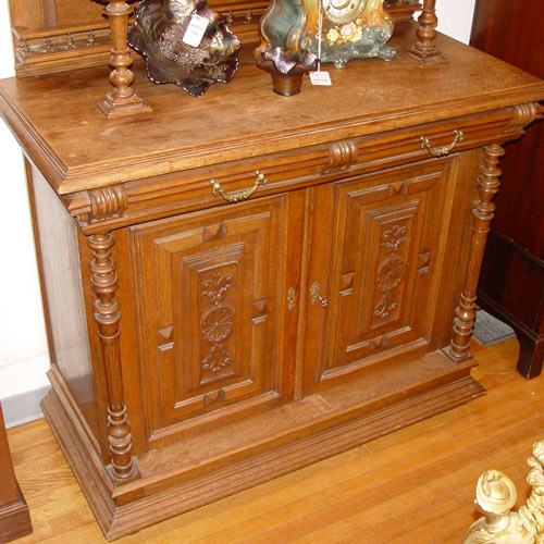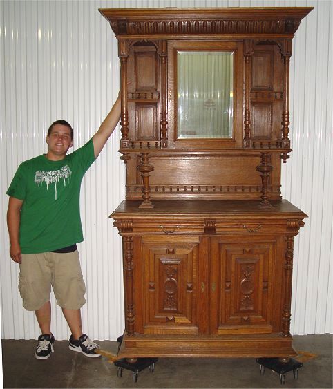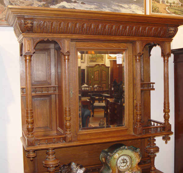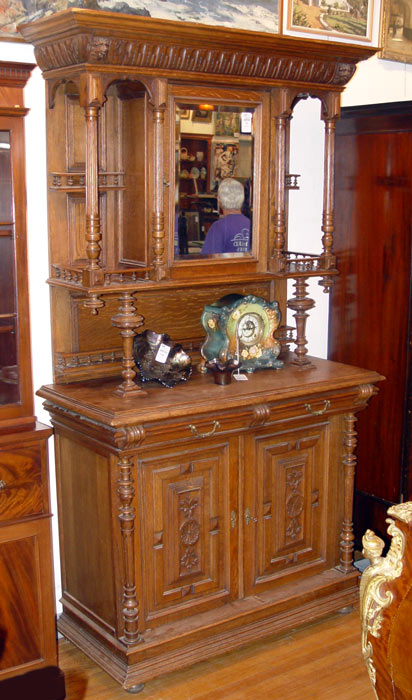CARVED OAK COURT CUPBOARD: 2 part cabinet with upper section having a carved cornice, mirrored door and open display with gallery. Lower section of 2 drawers over doors. Approx. 91''h. x 48'' wide x 22 1/2'' deep.