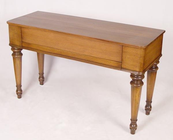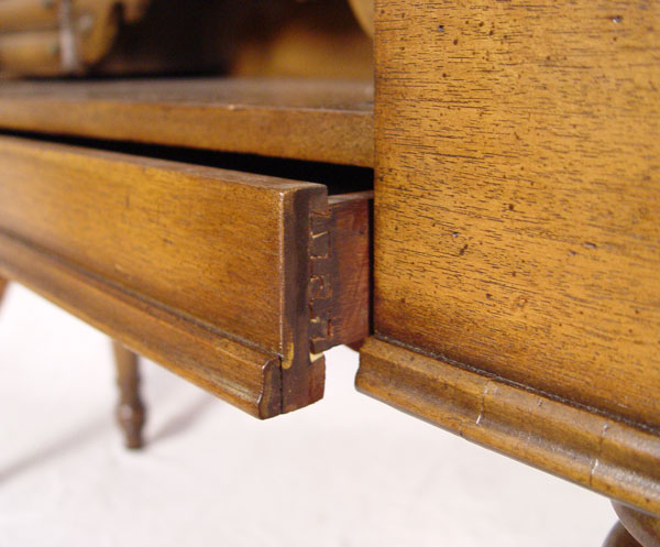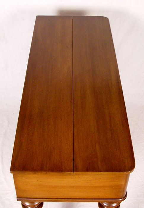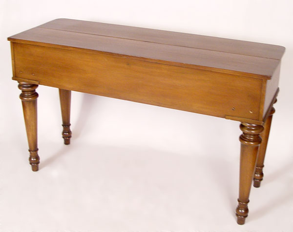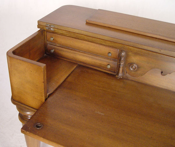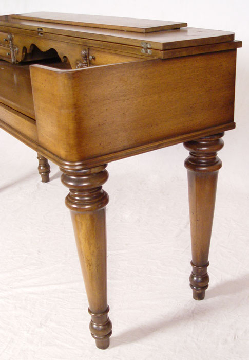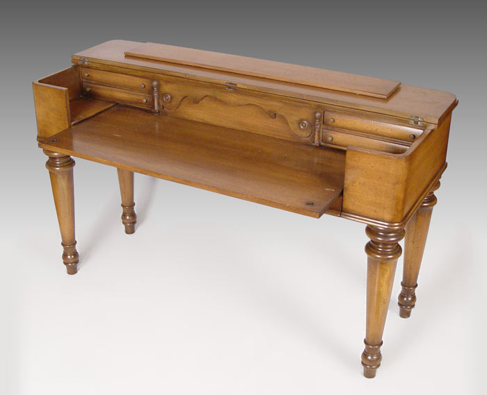 MID 20TH C WALNUT SPINET DESK: Hinged top with four drawer interior. Graceful tapered and turned legs. Measures 33 1/2'' x 56 1/4'' x 20 1/2''.