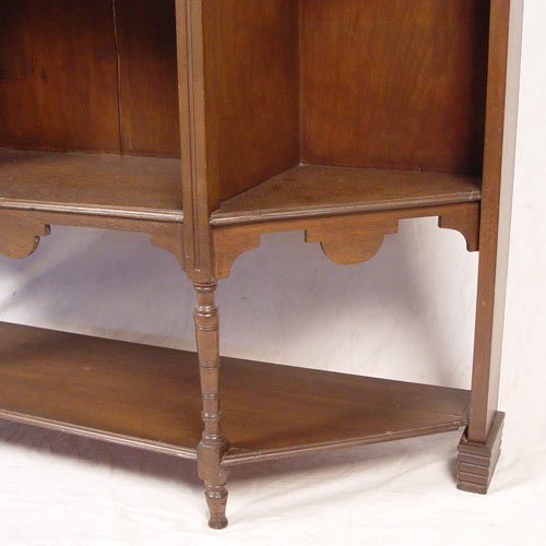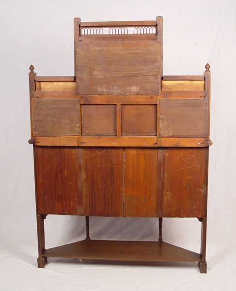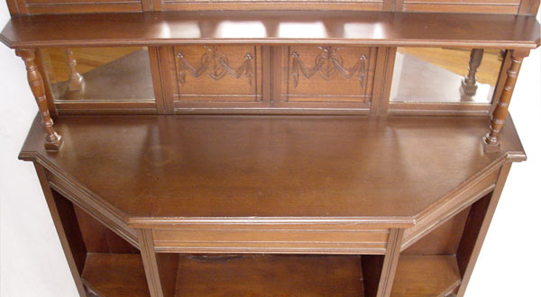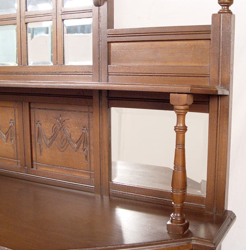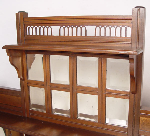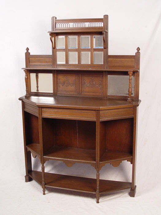 LATE VICTORIAN SIDE CABINET: A three side open shelf base with turned supports. Two tier backsplash with square beveled mirror panels, open fret gallery and finials. 68'' tall x 48'' x 15''.