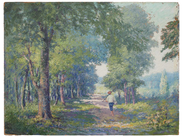 BOY HEADED TO FISHING HOLE OIL/B: 22 3/4'' x 30'', illegible writing verso. Acquired by consignor as a wedding present from Marie Lyon, who acquired it from The Copley Hotel in Boston, 1930's. Possibly Gustav Wiegand.