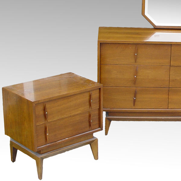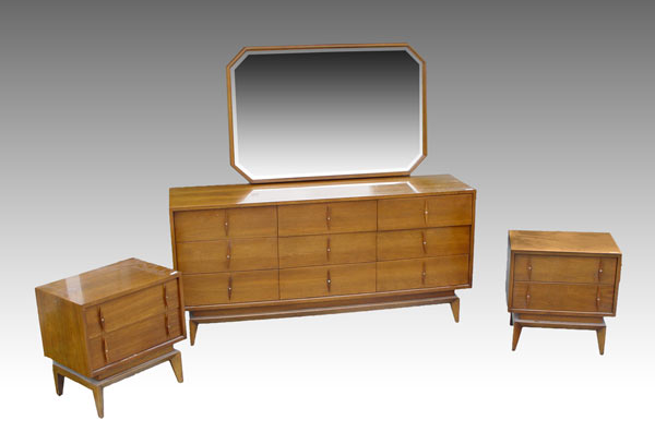 AMERICAN OF MARTINSVILLE MID CENTURY DRESSER AND NIGHTSTANDS: 4 piece modern maple to include 1) 9 drawer dresser, 32'' h. x 68'' x 19''. 2) Mirror, 48'' h. 32'' x 2''. 3) 2 nightstands, 23'' h. x 23'' x 16''