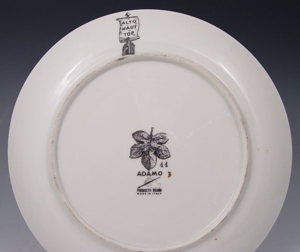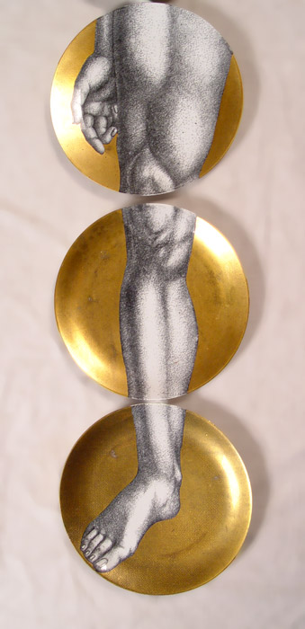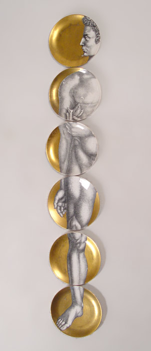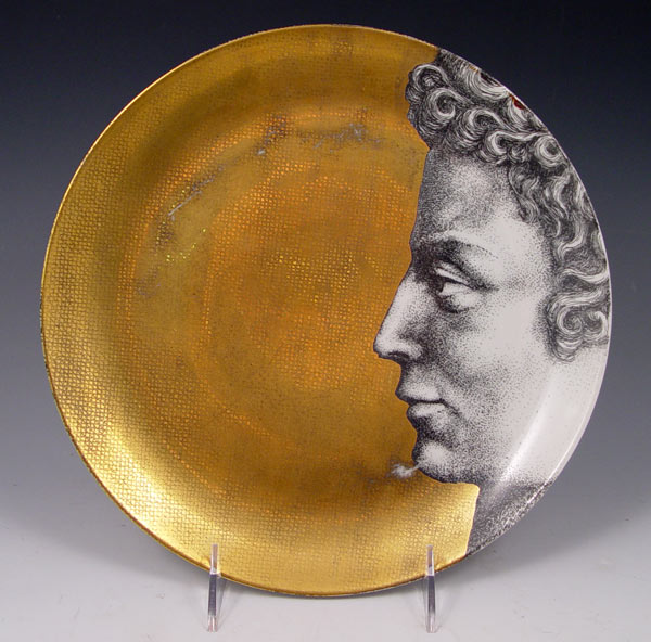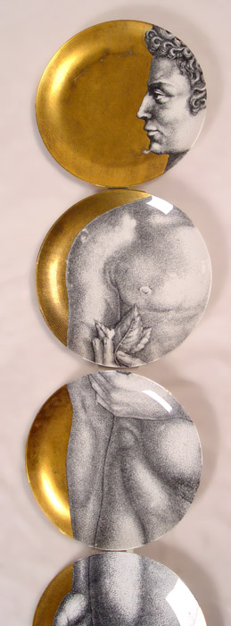6 FORNASETTI ''ADAMO'' PLATES: Transfer and gold decorated, approx. 10'' dia. Some wear several plates.