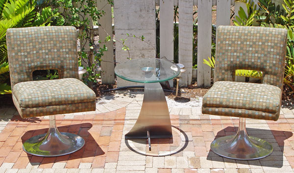 PAIR OF CONTEMPORARY ROMANO SWIVEL CHAIRS AND STAINLESS AND GLASS TABLE: Romano Quebec, chrome base, dot woven fabric