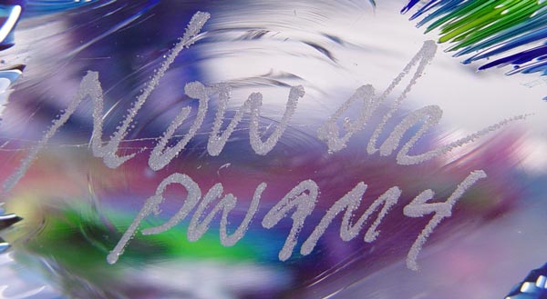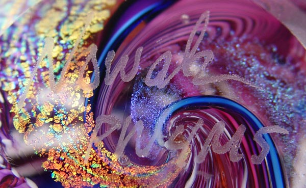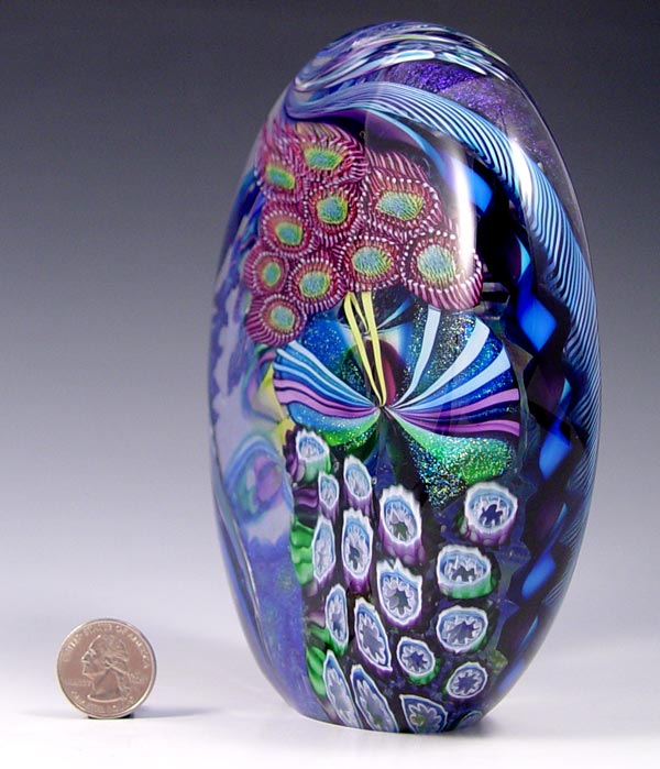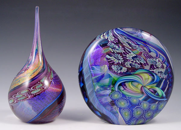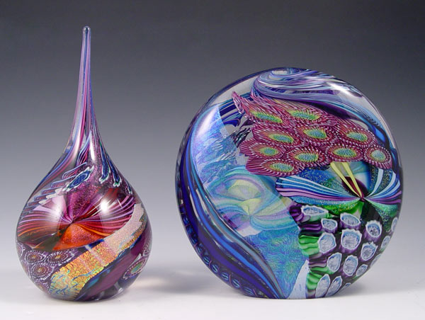 JAMES NOWAK HAND BLOWN ART GLASS PAPERWEIGHTS: 1)Dichroic Teardrop, approx. 8 1/2''h, 4''dia, signed on bottom and marked PW4M5. 2)Ovoid disc paperweight, dichroic, millefiori and ribbons in the design, 7''h. x 7''w x 2'', signed and marked PW9M4. Sold as a lot.