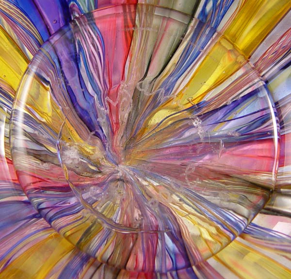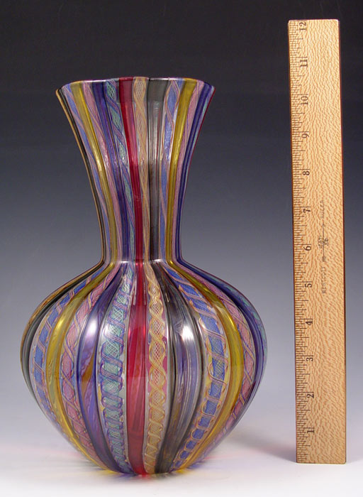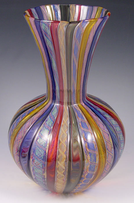 LARGE LATTICINO ART GLASS VASE BY LUCY BERGAMINI: Multi colored hand blown vase, approx. 10 1/2''h. x 6 1/2''dia., signed and dated 2000.