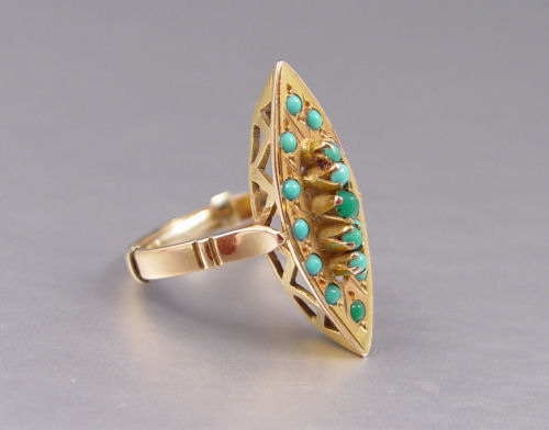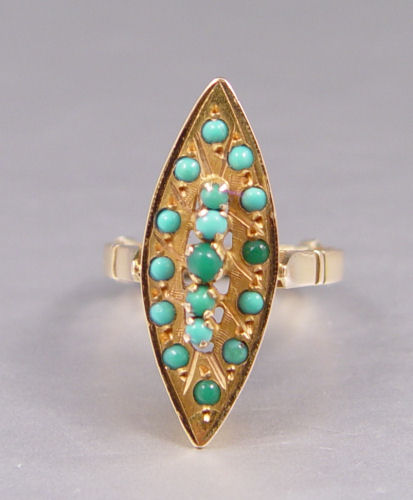 18K TURQUOISE RING: Unusual combination of turquoise and 14K yellow gold ring contains 1.5 mm round cabochon cut turquoise. Some are replacements of unknown origin. The stones are deep set. The ring is navette shaped. Weight 5.7 grams. Size 7.