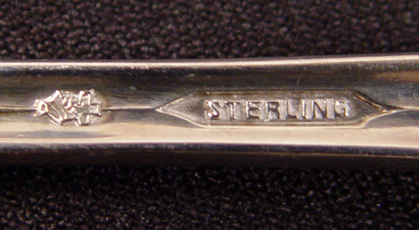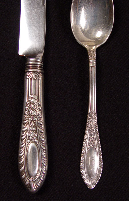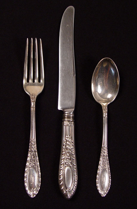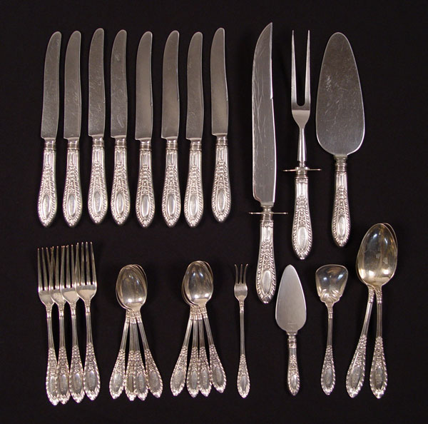 GADROONETTE STERLING FLATWARE SERVICE: By Manchester Silver Co. 28 Pieces to include 8 dinner knives (8 3/4''), 4 dinner forks (7''), and 8 teaspoons, 2 serving spoons, 2 piece carving set, pastry server, cheese server, lemon fork, and sugar or jelly server. Monogrammed. Approx. 26 troy oz. Sold with wooden silver chest, 3 1/8'' x 14 3/4'' x 10 7/8''