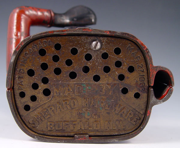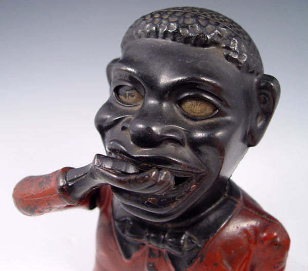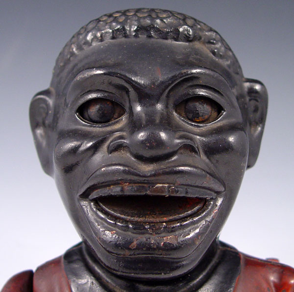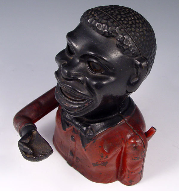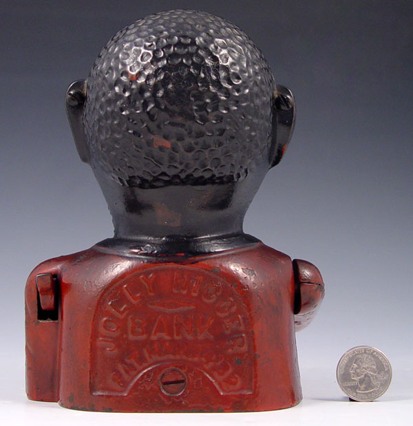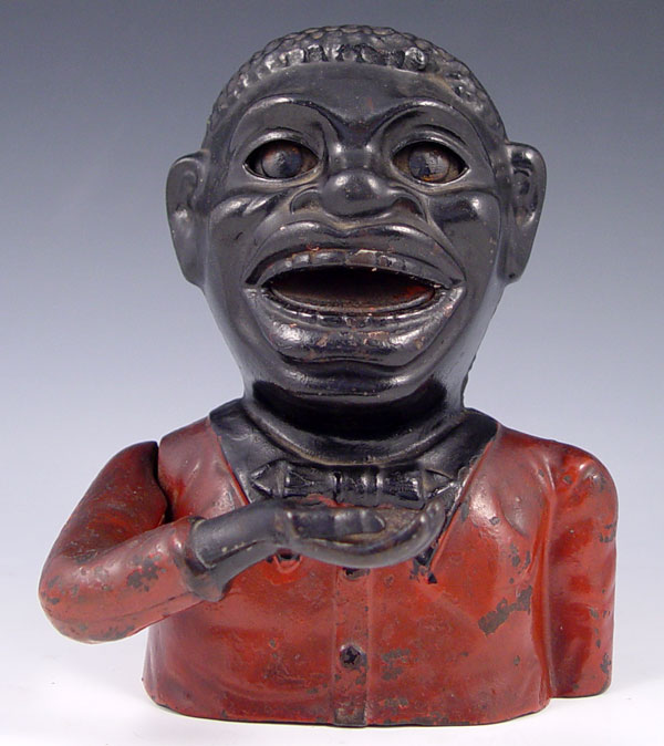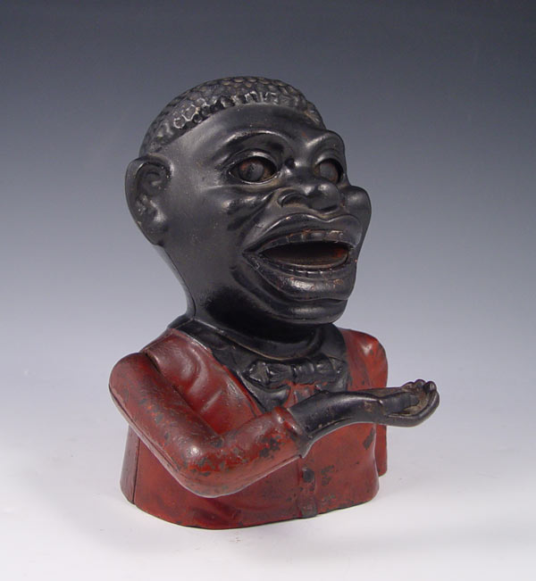 SHEPARD JOLLY NIGGER CAST IRON MECHANICAL BANK: Articulated arm, eyes & mouth. Cast with ''Jolly Nigger Bank Pat Mar. 14' 82'''. Bottom plate reads'' Made by Shepard Hardware Co. Buffalo NY. Pat'd in Canada March 27 1883''. Measures 6 3/4'' h. x 5 1/4'' x 6 1/4'' overall.
