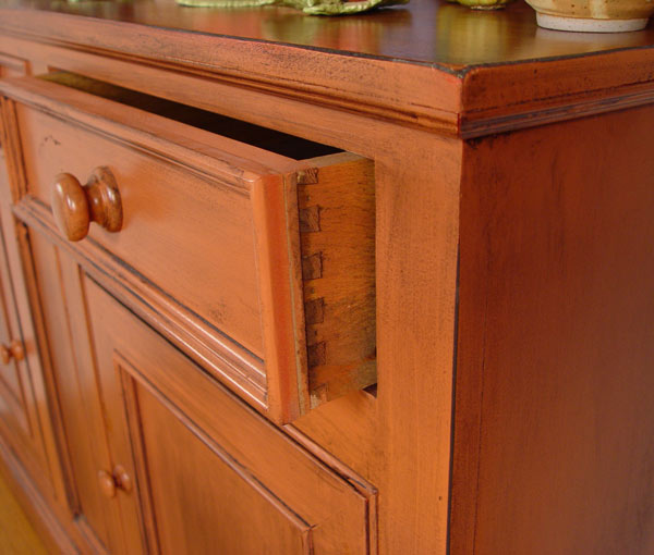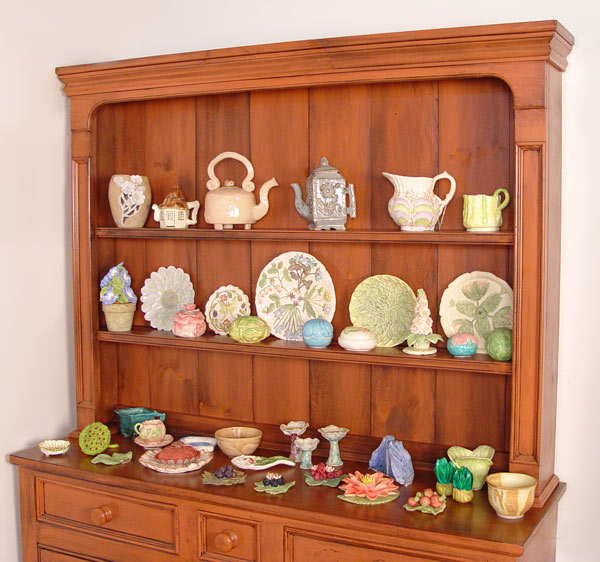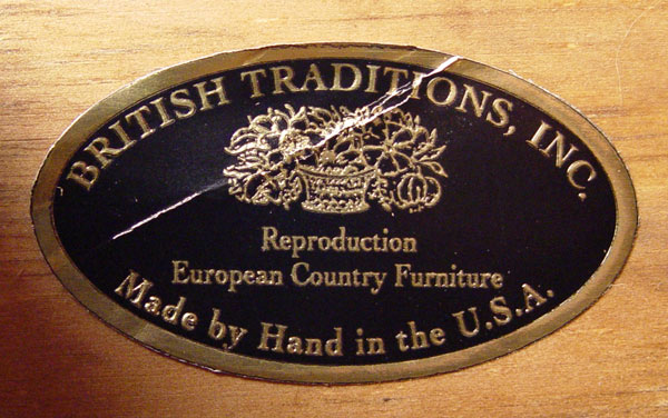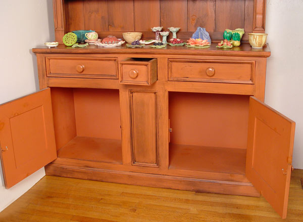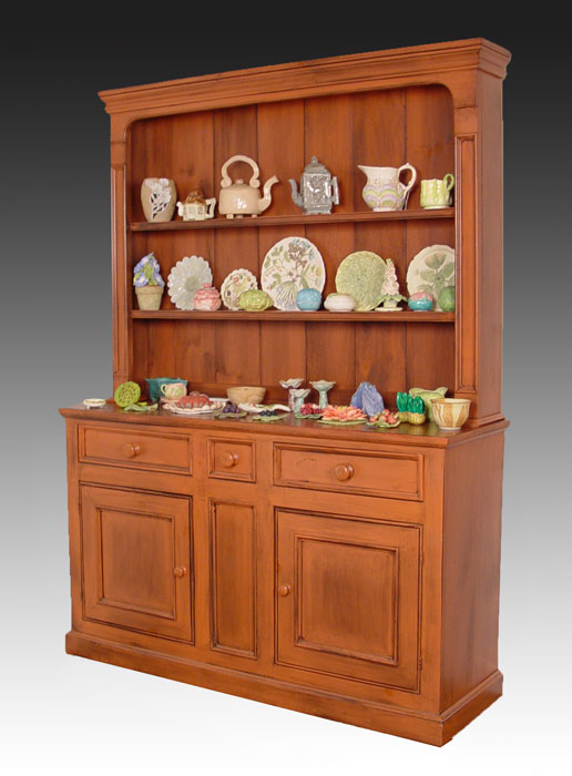 BRITISH TRADITIONS INC. COTSWOLD DRESSER: Made in USA by British Traditions Inc, makers of Reproduction European Country Furniture. Pine with painted finish , upper section open display, lower with two drawers over cupboard doors. Approx. 82''h. x 60'' x 19''.