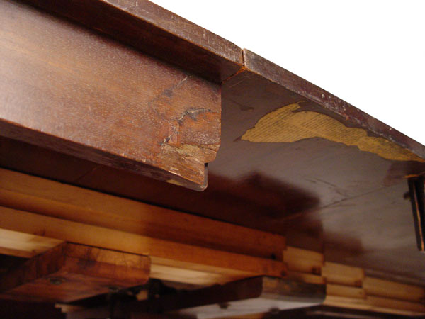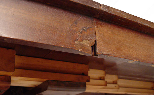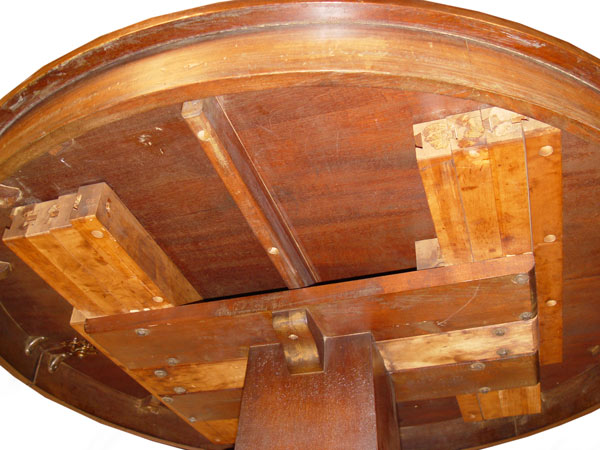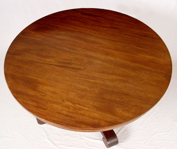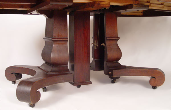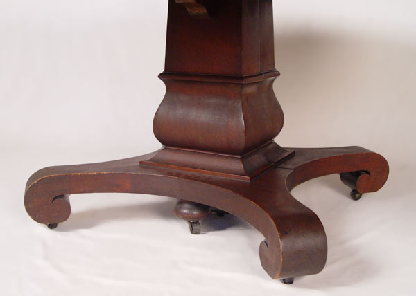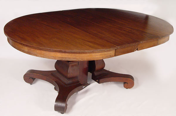 BERKEY & GAY MAHOGANY ROUND PEDESTAL DINING TABLE: Expandable mahogany table with three leaves, scrolled foot design with central leg support when open. Worn finish. Measures 29 1/2'' high x 54 1/4'' dia. closed, 89'' open