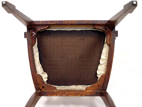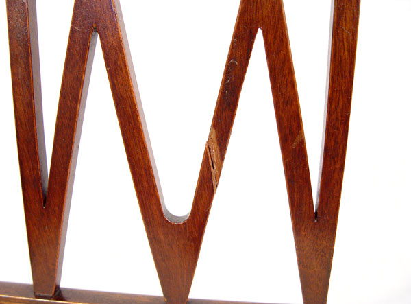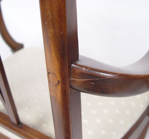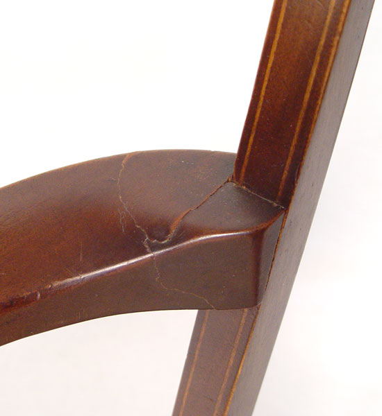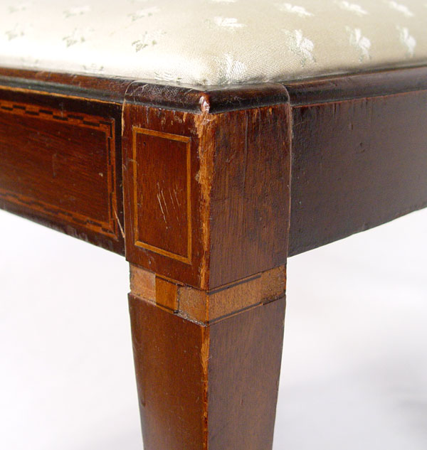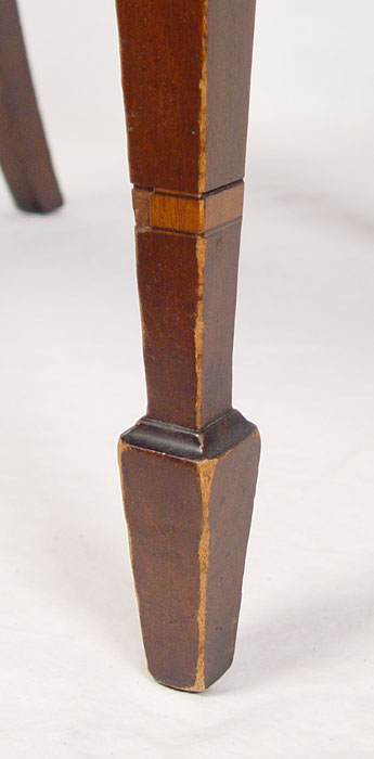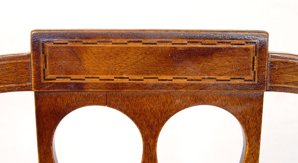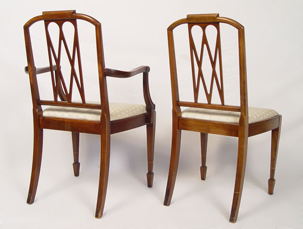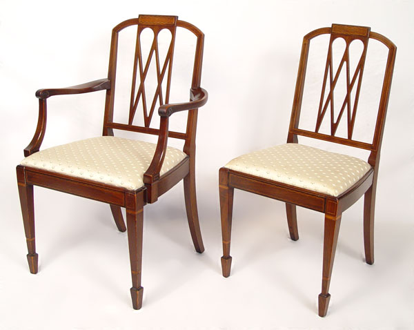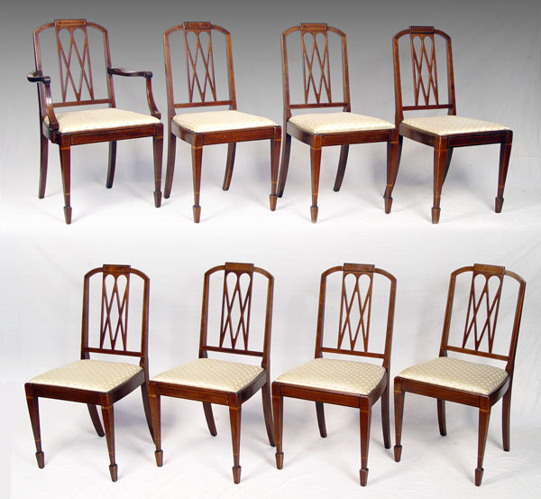SET OF 8 INLAID MAHOGANY HEPPLEWHITE STYLE DINING CHAIRS: 1 arm chair with 7 side chairs. Double crossed open fret back, inlay throughout, spade feet. 37 1/2'' tall 19'' x 20''.