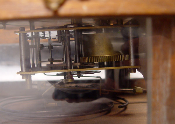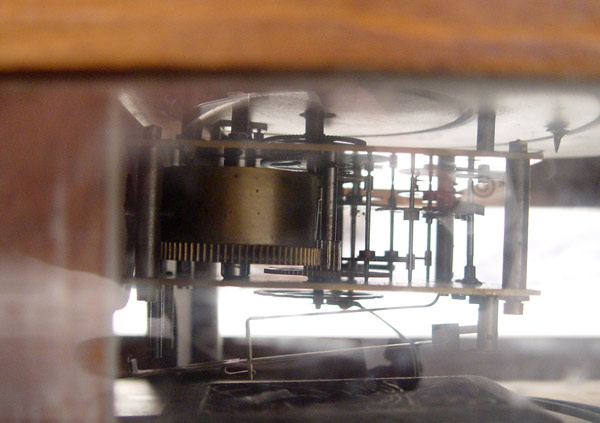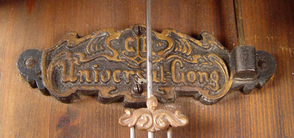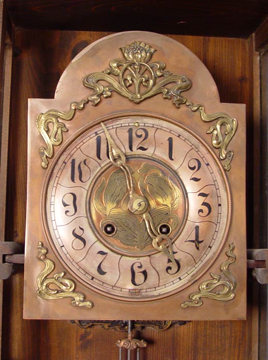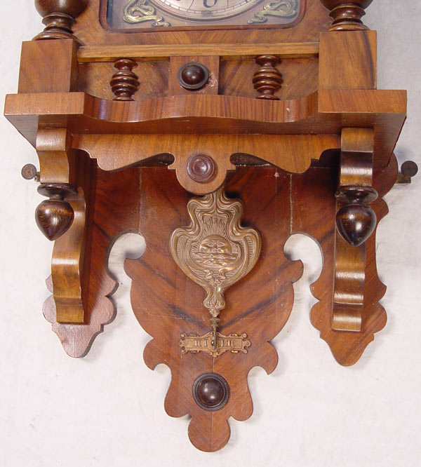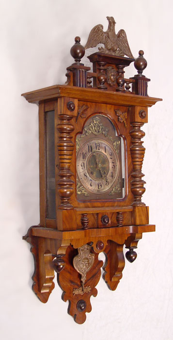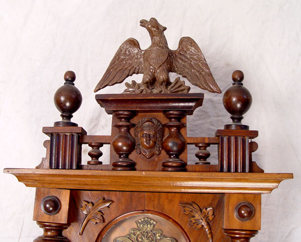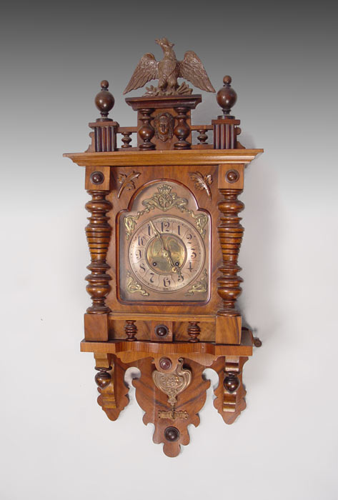 GUSTAV BECKER WALL CLOCK: Nouveau style 2 tone metal face. Wood case with applied decoration, architectural gallery and eagle finial. Key and pendulum movement. Measures approx 37'' h. x 16'' x8''