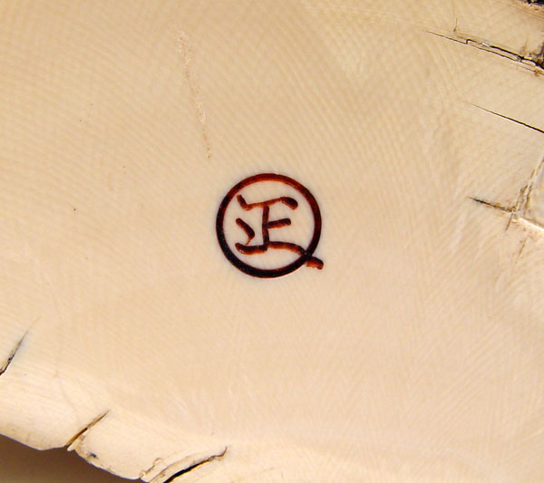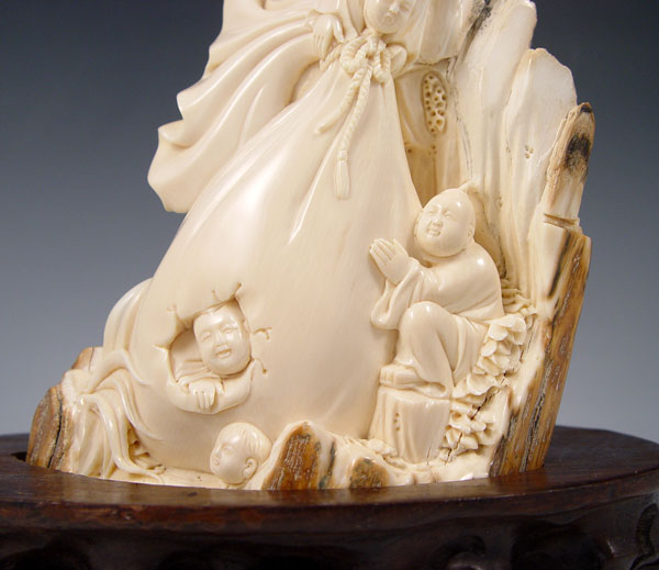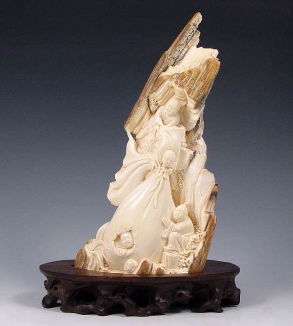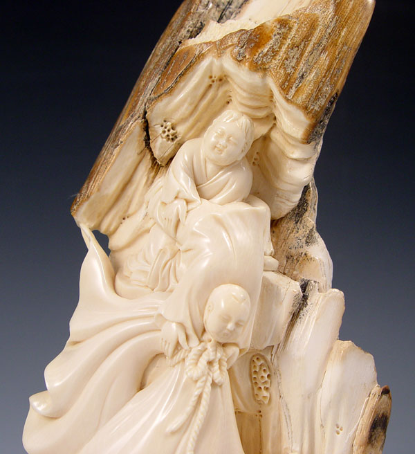 MAMMOTH IVORY CARVED FIGURAL TUSK: Tusk carved with scene of figures moving a large bag. On wood stand. Signed in characters on base. Ivory measures 7 3/4'' high, stand 1 1/8'' high x 5 3/4'' x 3 1/4''.