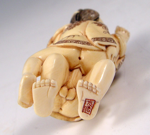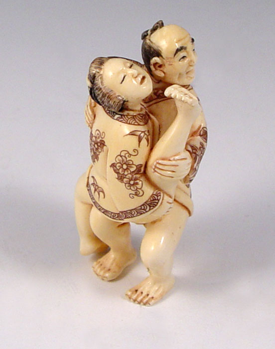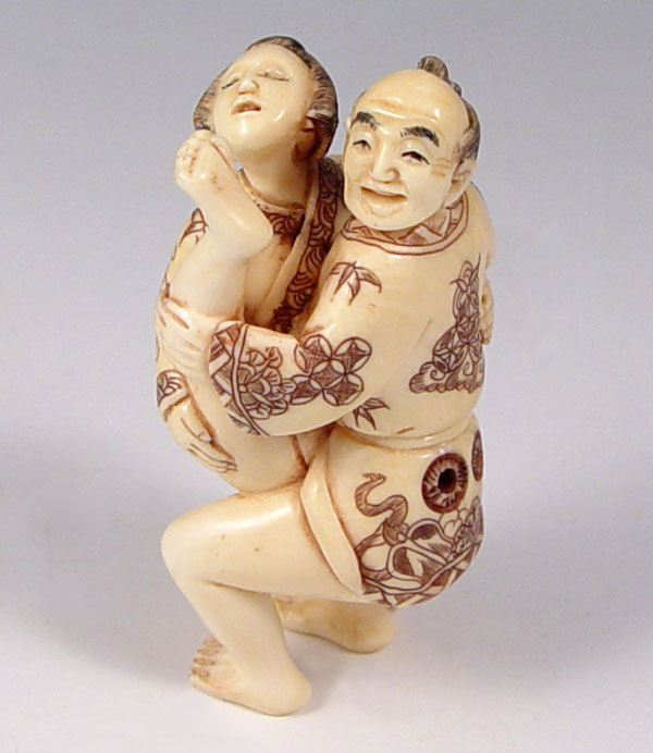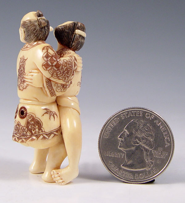 CARVED IVORY EROTIC NETSUKE: Graphic erotic with 2 figures. Signed in characters. Measures 2'' x 3/4''.