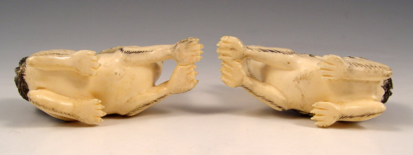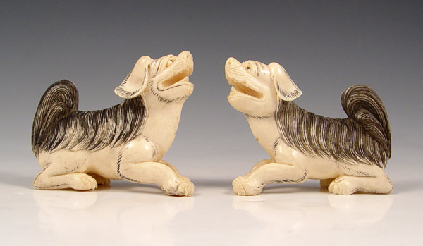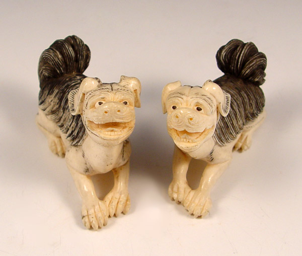 PAIR CHINESE CARVED IVORY FOO DOGS: Pair mirror image of each other. Unsigned. Measure 2 1/2'' h. x 2 3/4'' long.