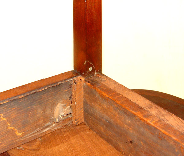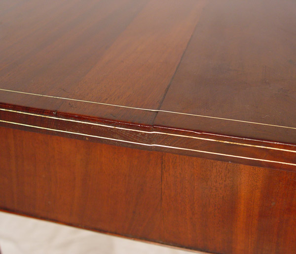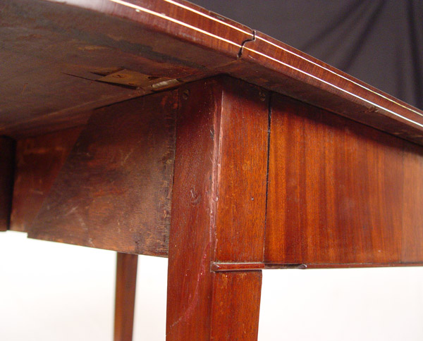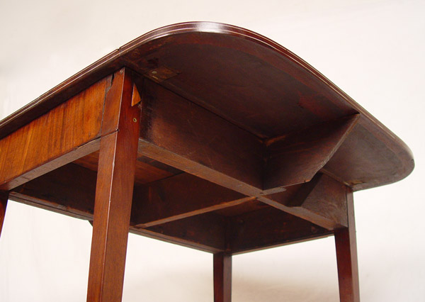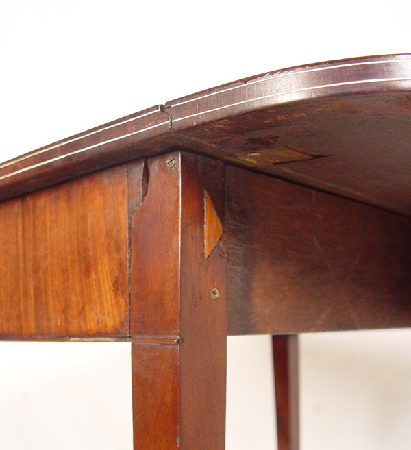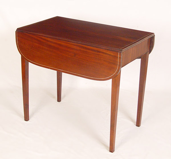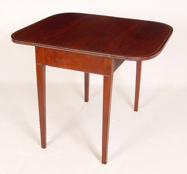 19TH C HEPPLEWHITE STYLE DROP LEAF TABLE: String inlay mahogany, possibly with ivory. Leaves with rounded corners. 28 1/2''h. x 33'' x 19'', extends to 36''.