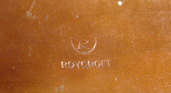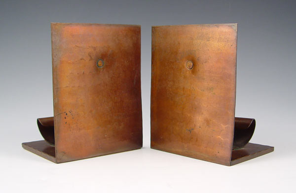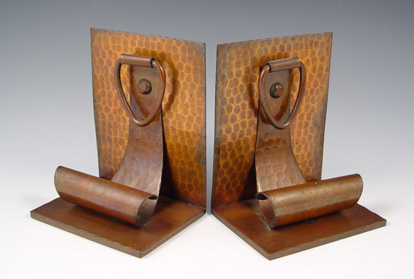PAIR ROYCROFT HAND HAMMERED COPPER BOOKENDS: Circa 1930, late mark. Applied scroll & ring. Measure 5'' h. x 3'' x 4''