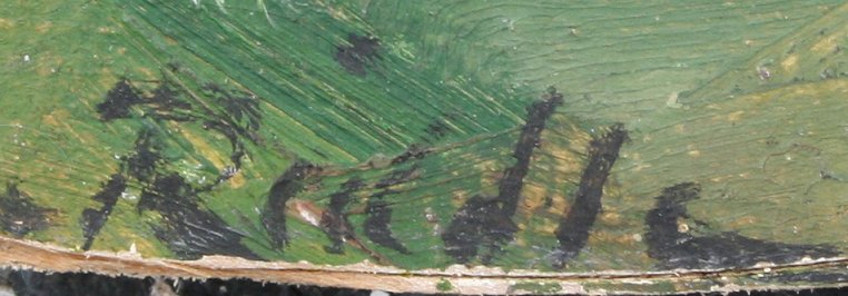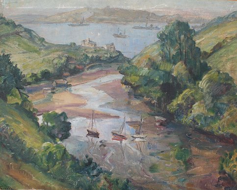 IMPRESSIONIST HARBOR VIEW FROM ABOVE OIL/B: Battleships and boats, illegibly signed lower left Riddle?, 16'' x 20'', unframed. Est. $300/500**