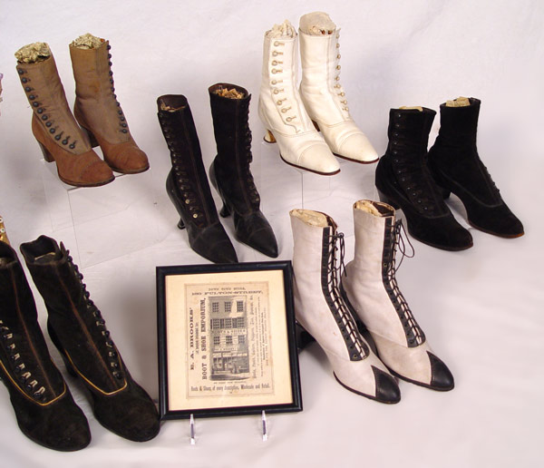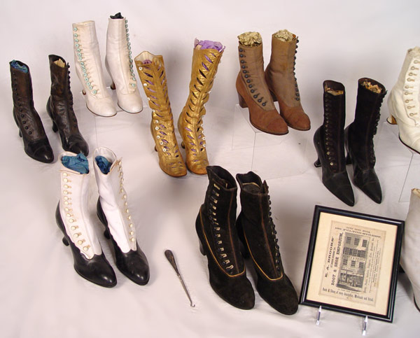 10 PAIRS VICTORIAN HIGH TOP SHOES: Leather high top button shoes in a variety of colors. The gold pair in the center was worn as part of a theatrical show of the period.