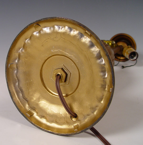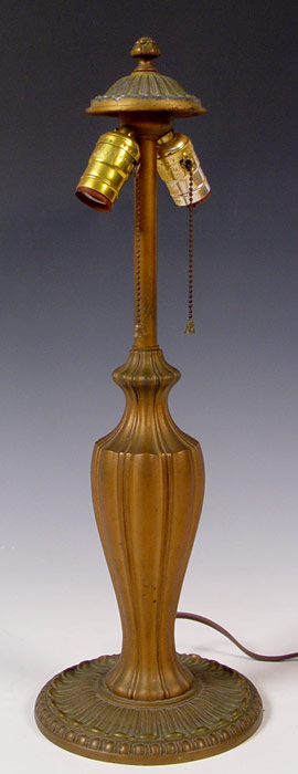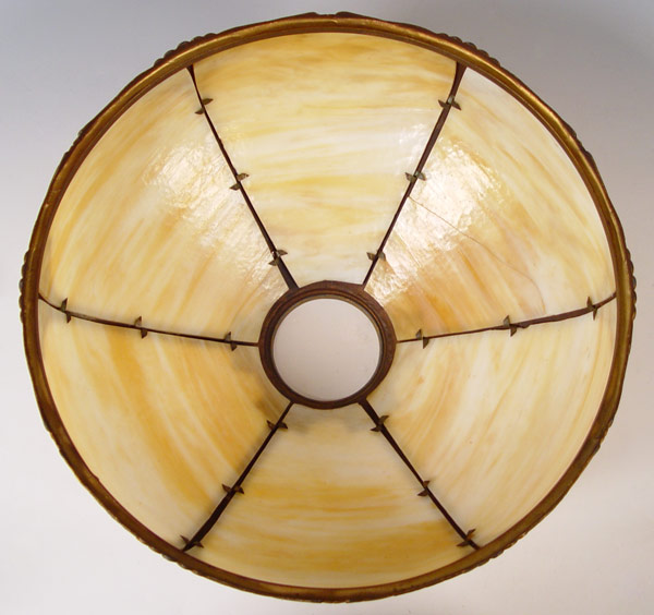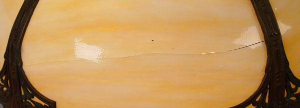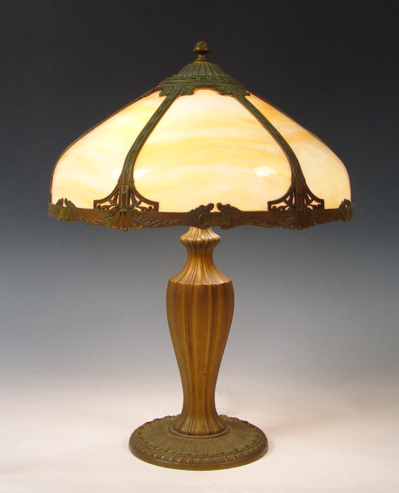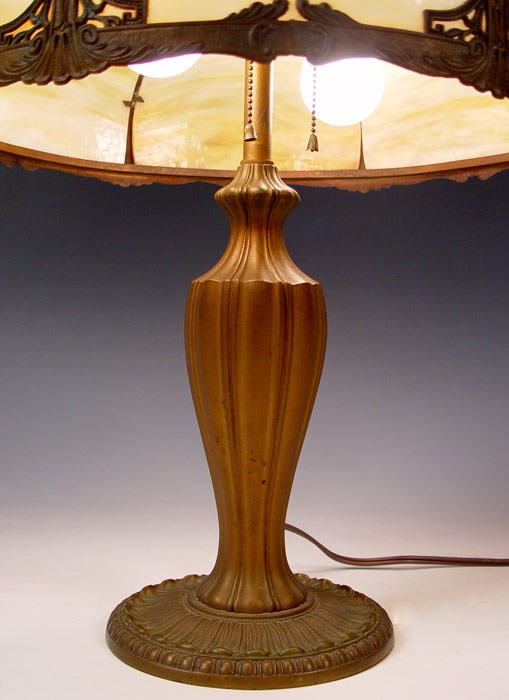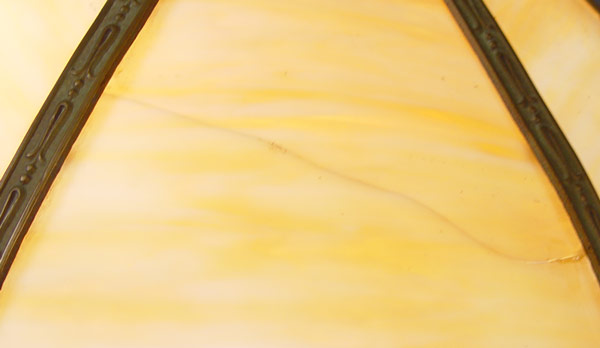 VINTAGE CARAMEL SLAG GLASS TABLE LAMP: Six bent panels, original finish with some green. Double socket, pull chains. Please note 2 cracked panels. 23'' tall, shade is 16 1/4'' dia.
