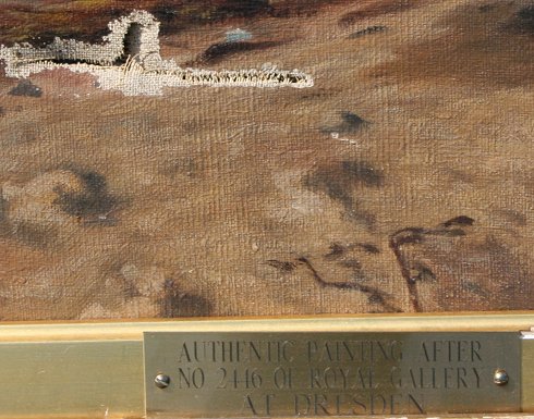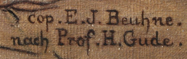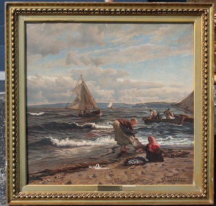 MUSEUM COPY OF H. GUDE PAINTING: Depicts Fisherfolk on a Shoreline with Boats, Oil/Canvas, 26 1/2'' x 28'', signed lower right E.J. Beuhne, gilded frame with wear, 32'' x 33''. Original hangs in Dresden. Est. $400/600**